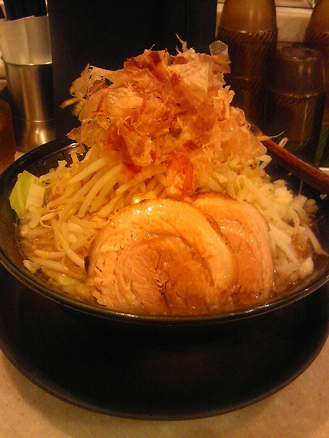 男40歳、今夜のおつまみ毎晩の晩酌をなによりの生きがいにしている中年おやじ。 2009年にWEBサイトから始めたブログも16年目。 すっかりアラカンのおっさんになってしまいました(笑) 日々の酒のおつまみとレシピを淡々と紹介します。 お手軽に作れる麺類レシピも。相互リンク募集中!PAGE | 324 323 322 321 320 319 317 316 315 314 313 | ADMIN | WRITE 2014.11.29 Sat 12:14:55 ラーメン勘九郎「ラーメン二郎への挑戦の道」シリーズ。 第4回目の今回は吉祥寺にある「ラーメン勘九郎」に行ってきました。 この勘九郎、前回訪問した「郎郎郎」のすぐとなりにあります。 地下にある店内に入ると、ジャズが流れるとってもお洒落な空間。 いままで訪問してきた店とはだいぶことなる趣です。 入り口にある券売機を見ると、二郎インスパイア系以外の普通のラーメンもあります。 今回の訪問の目的は「二郎への挑戦の道」なので、当然インスパイア系の メニューのほうをオーダー。勘九郎醤油 780円なり。 で、出てきたのが上の写真。 見た目のインパクトはそれなりにあります。 麺は中太くらいですかね。他の二郎とくらべるとやわらかめ。 豚は2枚。 普通のチャーシューを厚めに切ったくらいの感じ。 スープも二郎っぽいパンチがある味よりもかなりマイルド。 普通の醤油ラーメンスープを二郎寄りに味付けしてみましたというような感じで、 二郎になじみが無い人にも違和感なく食べられる味。 トッピングさられている鰹節との相性もとてもいい感じ。 無事完食致しました。 二郎インスパイア系というよりも、普通のラーメンを二郎っぽくアレンジしたって感じの味ですね。 店内の内装もショットバーみたいでおしゃれな雰囲気なので 二郎は食べてみたいけど敷居が高そうでちょっと自信がない、っていう人にお勧めなお店です。 「ラーメン二郎への挑戦の道」まだまだ続きます。 PR CommentsComment Form |