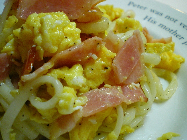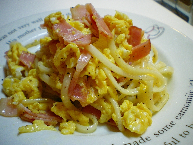 男40歳、今夜のおつまみ毎晩の晩酌をなによりの生きがいにしている中年おやじ。 2009年にWEBサイトから始めたブログも16年目。 すっかりアラカンのおっさんになってしまいました(笑) 日々の酒のおつまみとレシピを淡々と紹介します。 お手軽に作れる麺類レシピも。相互リンク募集中!PAGE | 76 77 78 79 80 81 82 83 84 85 86 | ADMIN | WRITE 2009.08.05 Wed 20:00:00 ざるうどんのイタリア風炒め昼食のときに余った「ざるうどん」を炒め物にしてみました。 ・材料 うどん 50gくらい 卵 1個 ベーコン 2枚 オリーブオイル 少々 塩・黒胡椒 ・作り方 うどんはあらかじめ多めのオリーブオイルをかけてなじませておく。 フライパンに油をひき卵を炒め、一旦取り出す。 ベーコンを炒め火が通ったら、弱火にし卵を戻しうどんを加える。 さっと混ぜ合わせたら、塩・黒胡椒で味付けして完成。 食べた感じは、やや柔らかめではありますがまんま「パスタ」です。 まあ、パスタもうどんも原材料は同じ「小麦粉」だし(笑 オリーブオイルを使ったためか、意外なほどイタリアンっぽい味になりました。 作った本人もちょっと驚きです。 ざるうどんが余ったときには是非お試しください。 PR 2009.08.04 Tue 20:00:00 ねぎ塩豆腐2009.08.03 Mon 20:00:00 ジャーマンポテト2009.07.31 Fri 20:00:00 牛肉と豆腐の辛味噌炒め2009.07.29 Wed 20:00:00 茄子と牛肉とピーマンの炒め物 |